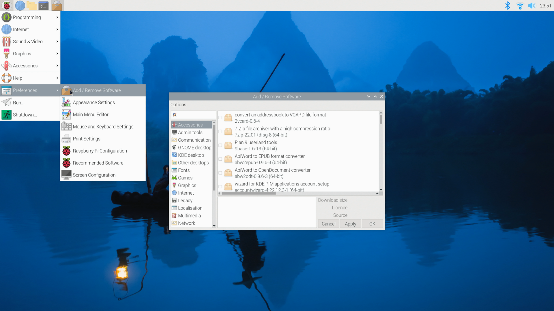 在Raspberry Pi OS系统中,提供了一个添加添加删除软件的工具,可以点开应用菜单->Preferences->Add / Remove Software打开。如下图: