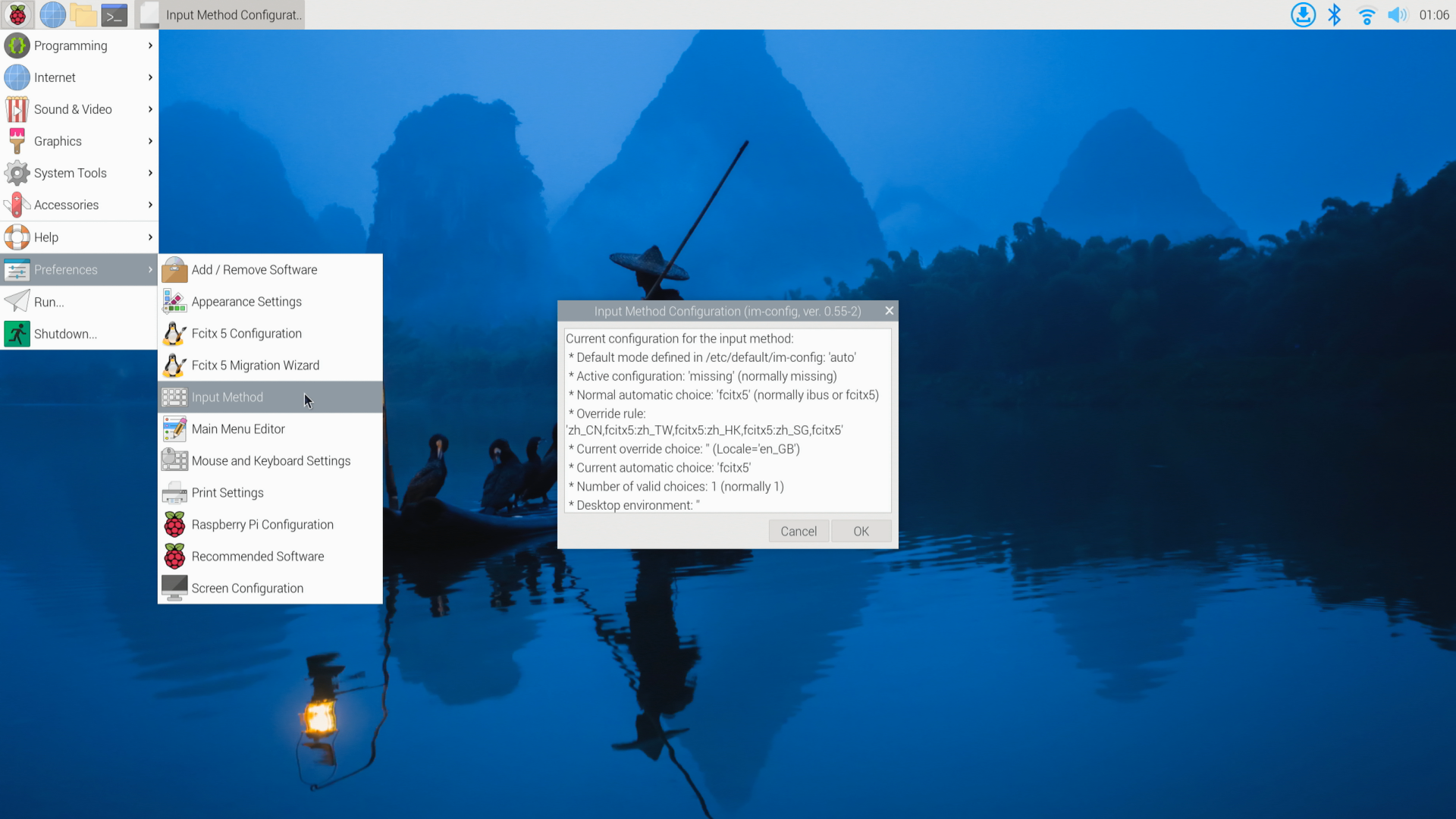 这样我们就安装好了,这时候我们打开一下应用菜单 -> Preferences -> Input Method,确认上面显示的Current automatic choice是fcitx,那我们就可以确认退出了。(如果你点击OK,后面弹出来的界面选择否,表示不用更改)