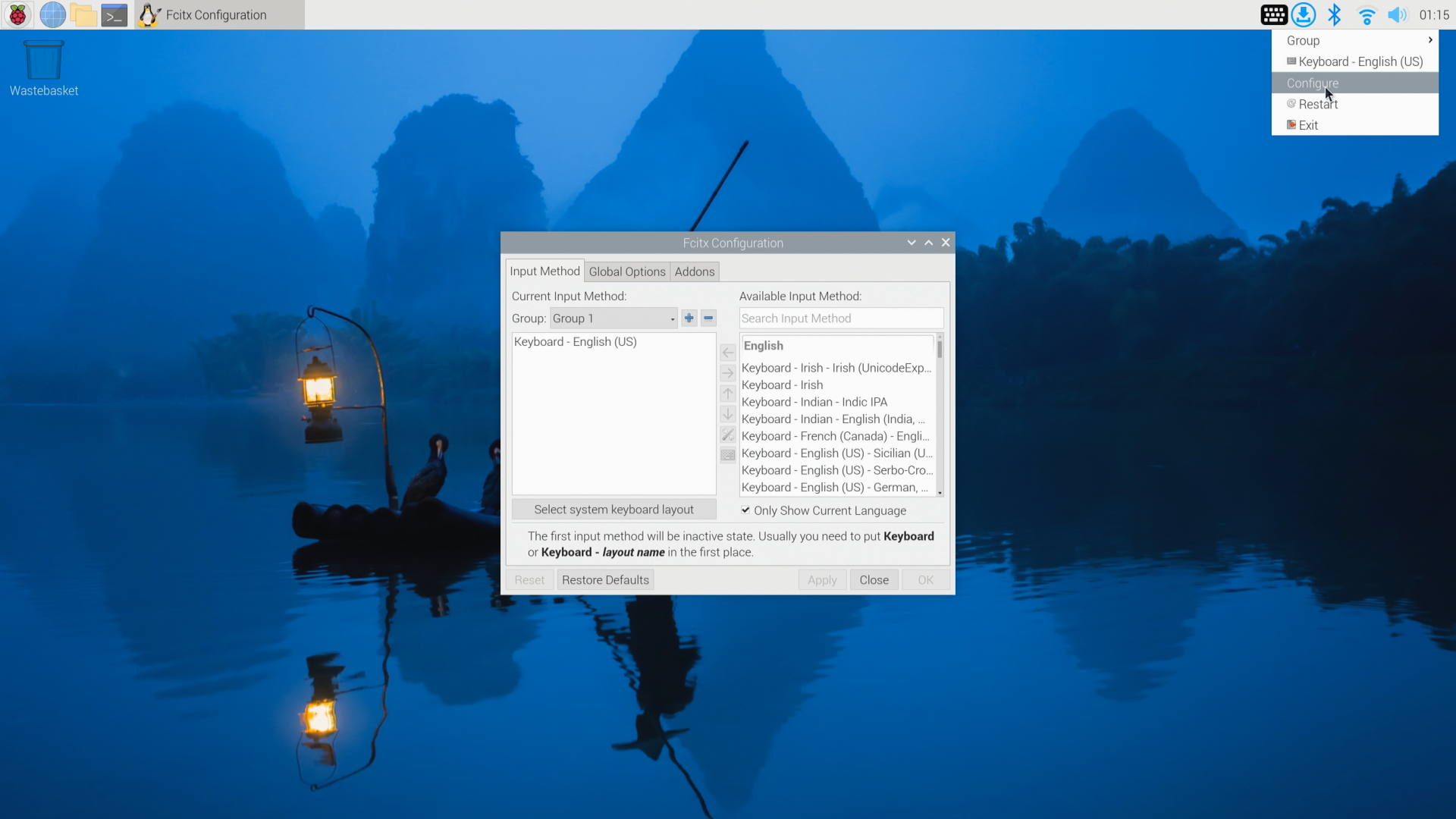 然后我们手动从应用菜单启动一下Fcitx,路径是应用菜单 -> System Tools -> Fcitx 5。打开后发现右上角出现了输入法的图标,但是这时候他是没有拼音输入法的,我们需要手动添加pinyin输入法