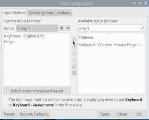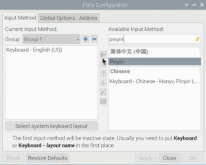 在弹出的设置窗口中,我们在右边直接输入pinyin来搜索输入法,选中pinyin后按中间的左箭头加入输入法中,如图: